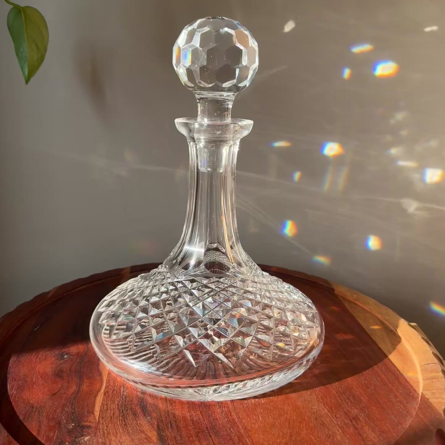 Elevate your spirits with the Antique Waterford Crystal Ship's Decanter, a stunning example of the renowned Lismore pattern. Crafted from clear lead crystal and hand-cut to catch every glint of light, this decanter brings maritime elegance to your table, home bar, or display shelf.